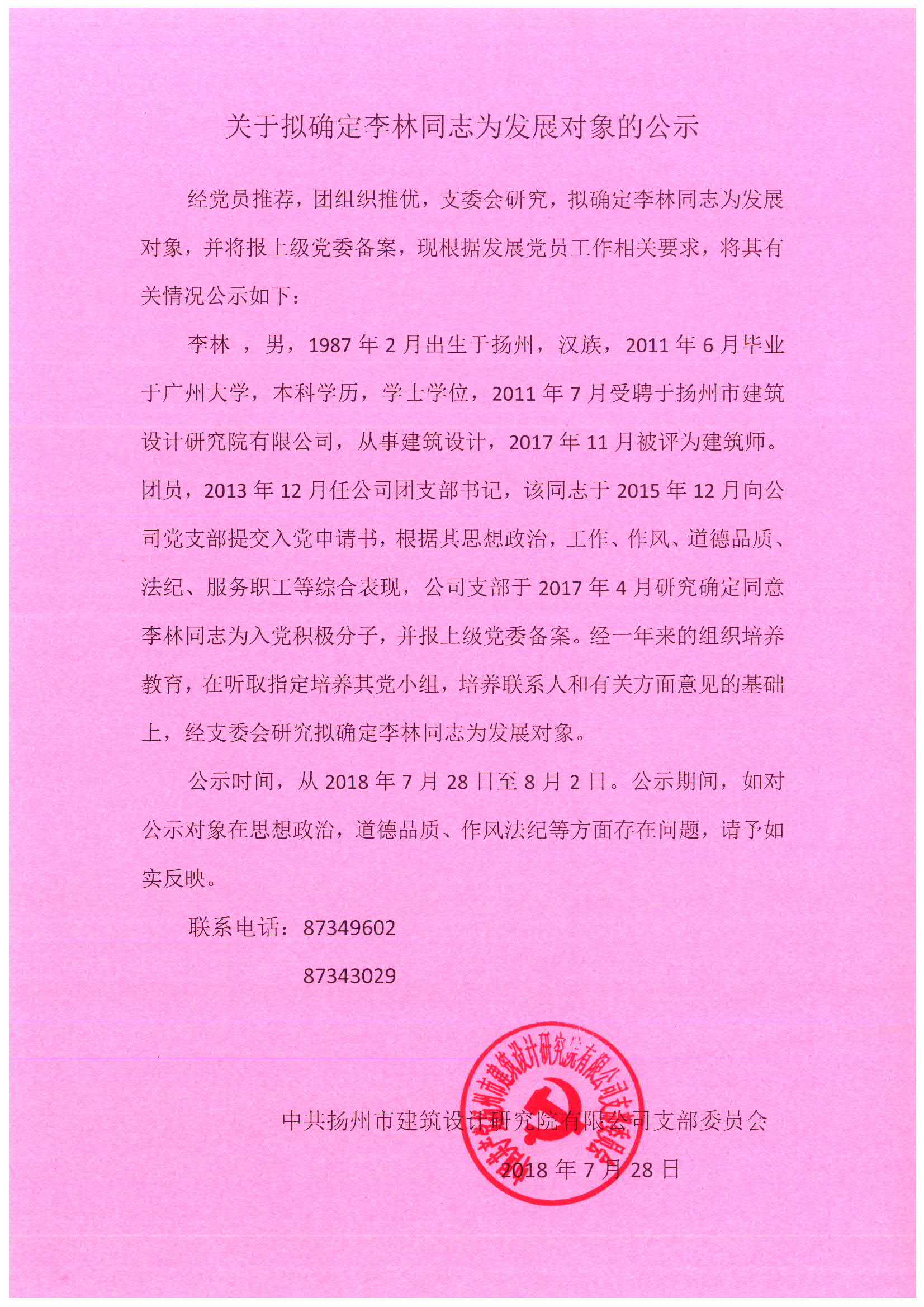 關(guān)于擬確定李林同志為發(fā)展對象的公示